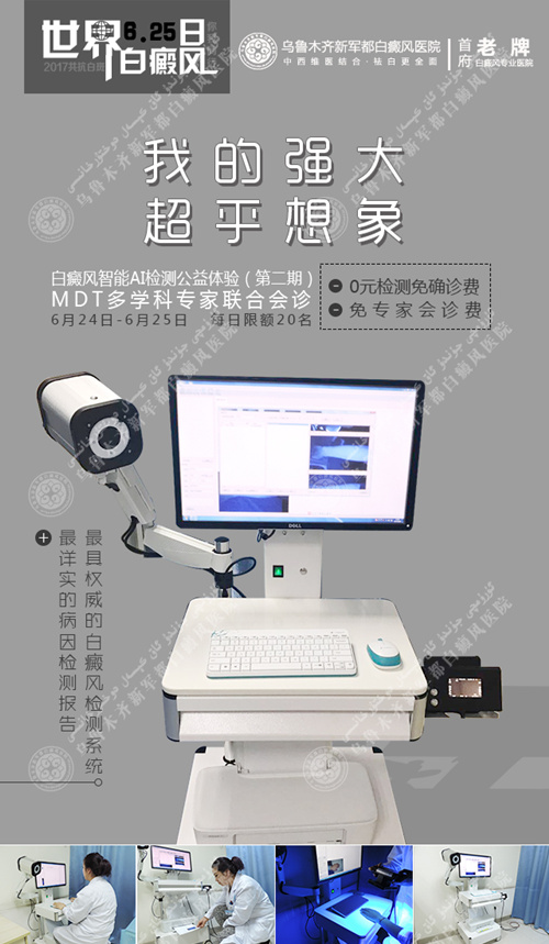 乌鲁木齐新军都白癜风医院是新疆首家引进白癜风智能AI成像检测系统的医院,该设备利用计算机软件技术,通过各模块的应用,完善的统计、记录、存储、查询病例功能为管理提供了准确的数据;同时拥有强大的图像处理功能,以及丰富的病因分析、诊断治疗信息数据,规范了临床检查的统一性与规格,减少了漏诊与误诊的发生,使白癜风检查更加简洁、实用、性价比提高,正成为白癜风检查的必然趋势。