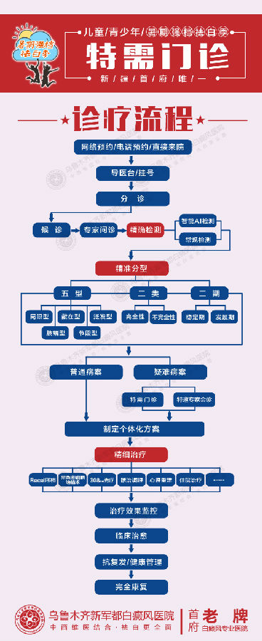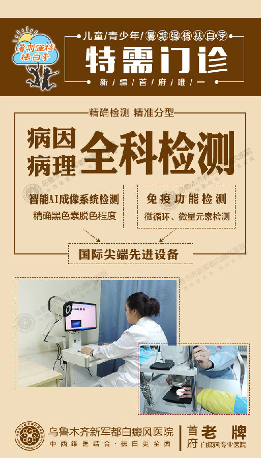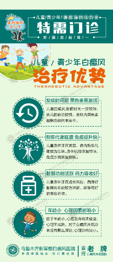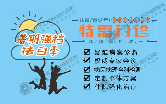 儿童青少年白癜风患者来院就诊享受“病因病理全科检测、疑难特殊病案诊断、特邀知名专家会诊、个体诊疗方案定制、住院强化治疗、优化就诊绿色通道”等特殊化服务诊疗。暑期强档祛白季儿童、青少年特需门诊的开通,必将有效促进儿童青少年的身心健康成长,标志着新疆儿童青少年白癜风的防治事业再次提速。
