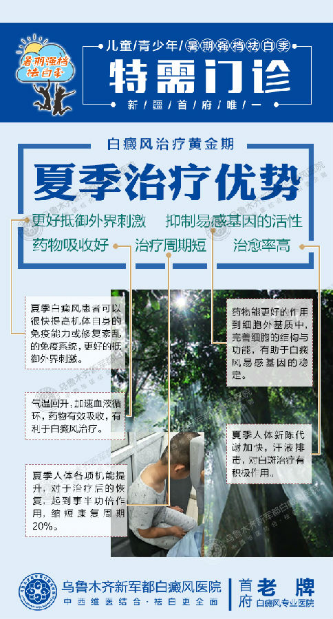 夏季是白癜风高发季,也是白癜风治疗佳季。儿童青少年暑期治疗白癜风,除了夏季带来的好处之外,还有着与其自身身体、心理相适应的优势。针对白癜风持续低龄化和高发问题,同时为鼓励儿童青少年白癜风患者暑期及时就诊,早日恢复健康,乌鲁木齐新军都白癜风医院再次率身先行,开展暑期强档祛白季,特别开通儿童、青少年特需门诊,助力广大患者夏季祛白。