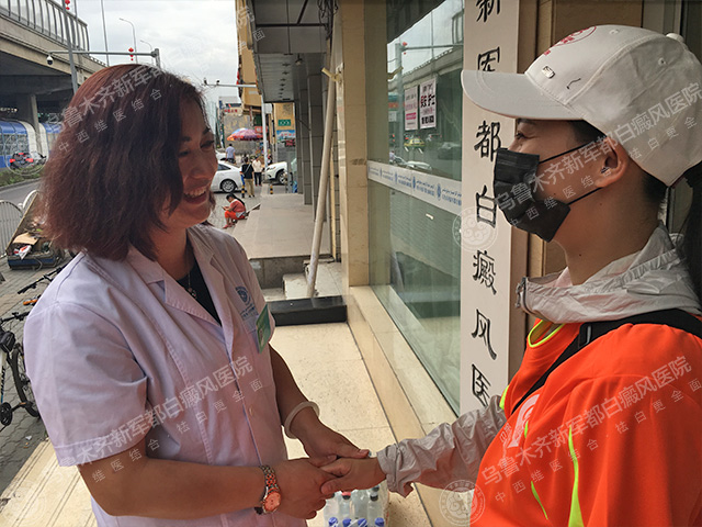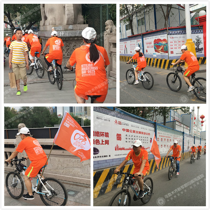 6月25日一大早,身着“拒绝歧视 环城健骑”统一服装的骑行车队就来到了位于西北路73号的乌鲁木齐新军都白癜风医院门口,新军都医务人员帮助骑手们做好骑行前的准备工作。11时整,车队准时从新军都医院出发,在酷热的天气下,骑手们不辞辛苦,沿友好西桥 → 友好北路 → 友好南路 → 新华北路 → 新华南路 → 人民路 → 和平南路 → 钱塘江路 → 宝山路 → 西北路一路骑行,最后回到医院。行程中统一着装的骑行队伍受到众多市民的关注,许多市民纷纷拿出手机拍摄并发到自己的朋友圈。骑手们也在沿途中的一些站点短暂停下,与路人合影留念,呼吁更多的大众对白癜风患者少一份歧视,多一份关爱。