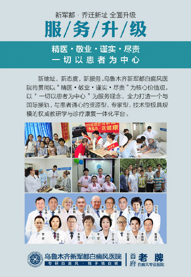 新地址,新态度,新服务。乌鲁木齐新军都白癜风医院将贯彻以“精医·敬业·谨实·尽责”为核心价值观,以“一切以患者为中心”为服务理念,全力打造一个与国际接轨,与患者通心的资源型、专家型、技术型极具规模的权威教研学与诊疗康复一体化平台。