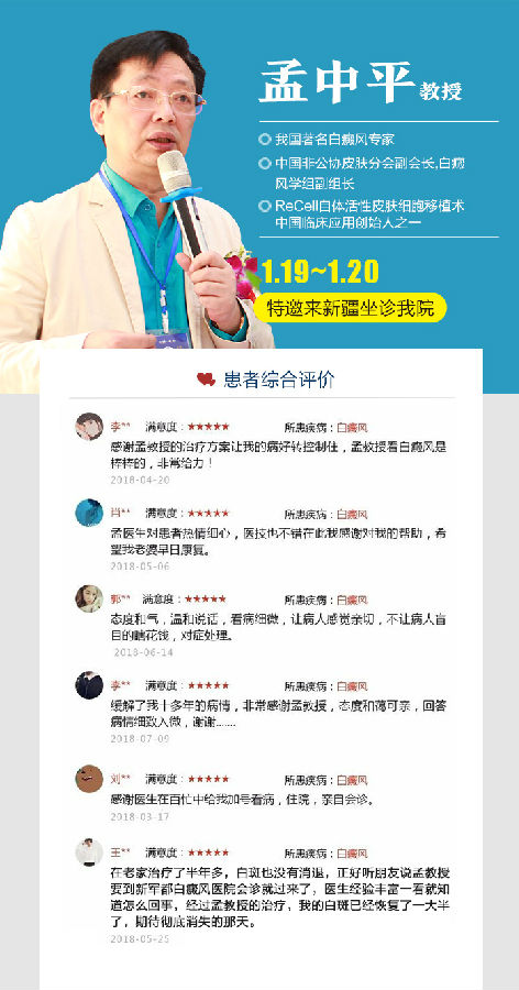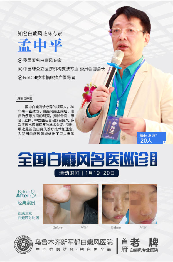 乌鲁木齐新军都白癜风医院自建院以来,已开展了86期的全国白癜风名医巡诊活动,其中不乏北京上海等行业内一线的白癜风专家。为了更好的服务广大患者,让新疆患者享受权威专家的诊疗服务,乌鲁木齐新军都白癜风医院将于1月19日、20日举行第87期全国白癜风名医巡诊活动,国内著名白癜风专家孟中平教授领衔开展“专家多学科(MDT)”联合会诊,定制专属的个性化治疗方案,帮助患者抓住治疗佳期早日康复。