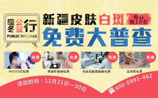 针对缺少全面检查造成误诊率高、白癜风患者缺乏科学有效等治疗问题,乌鲁木齐新军都白癜风病医院切实践行公益行动,于2016年11月21日-30日,开展“暖冬公益行新疆皮肤白斑免费大普查”,活动期间患者可以享受WOOD检测、微循环检测、免疫或酪氨酸酶检测、血常规等针对白斑的专科检测全免(每天限10名初诊患者)。