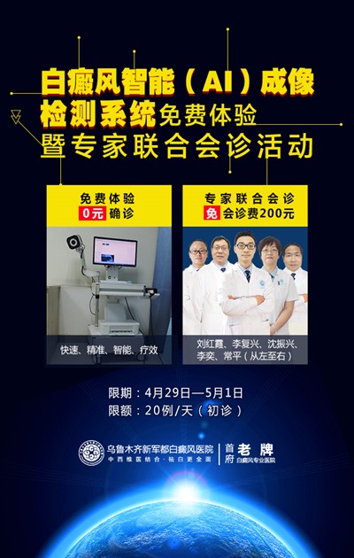 4月29-5月1日,新疆白癜风诊疗示范医院——乌鲁木齐新军都白癜风医院举行“白癜风智能(AI)成像检测系统免费体验暨专家联合会诊活动”,此次活动为4月29—5月1日,此次活动免仪器检测费和专家会诊费,为确保诊疗质量,每天限诊20名初诊,即日起接受预约,预约挂号热线4000991462,微信公众号预约:xjdbdfyjy。预约患者当天凭预约号前往位于乌鲁木齐西北路73号(哈密大厦对面)的乌鲁木齐新军都白癜风医院接受会诊。